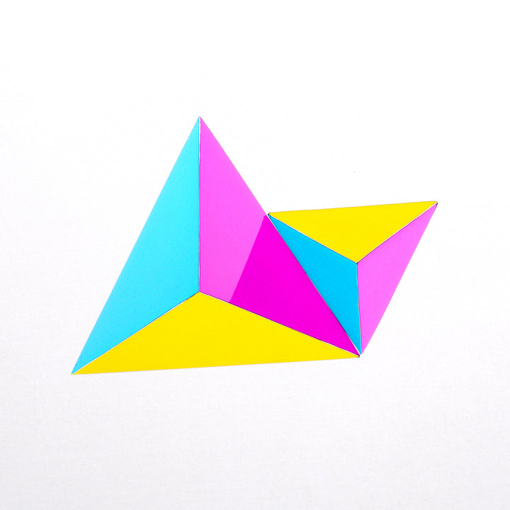 The Ignis CMY Tetrahedron is a beautiful polyhedron composed of four triangular faces, six straight edges, and four vertex corners. The Tetrahedron is the simplest of all the ordinary convex polyhedra and the only one that has fewer than 5 faces. It is one of the 5 Platonic solids.