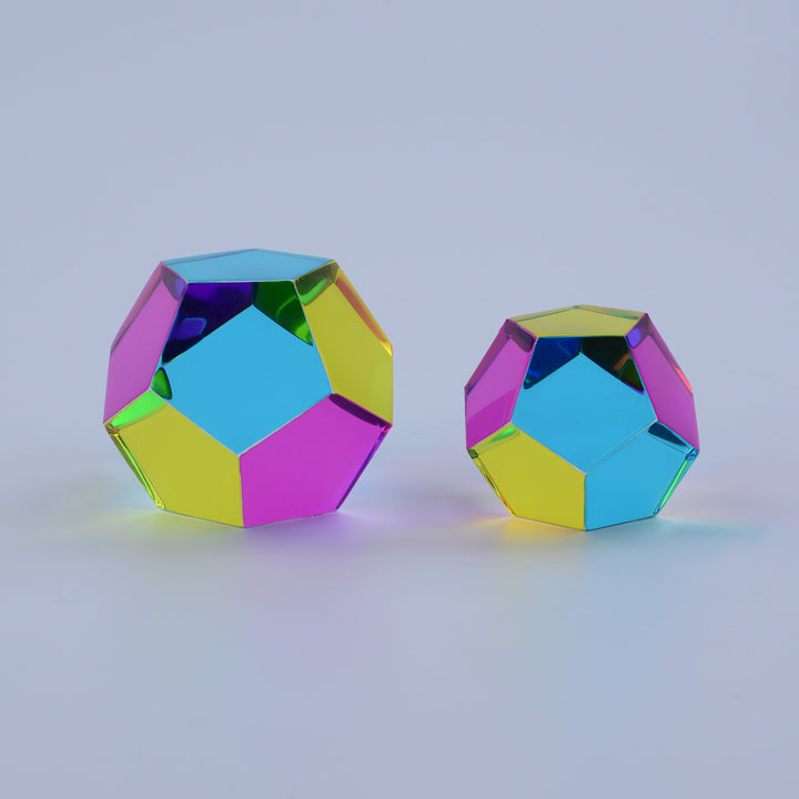 The Mundus is a one kind CMY dodecahedron. It's a beautiful 12 sided polyhedron created from 12 pentagons and acts as a kaleidoscope when spun around, creating new colours at every angle. It is one of the 5 Platonic solids.